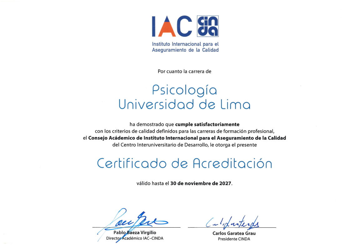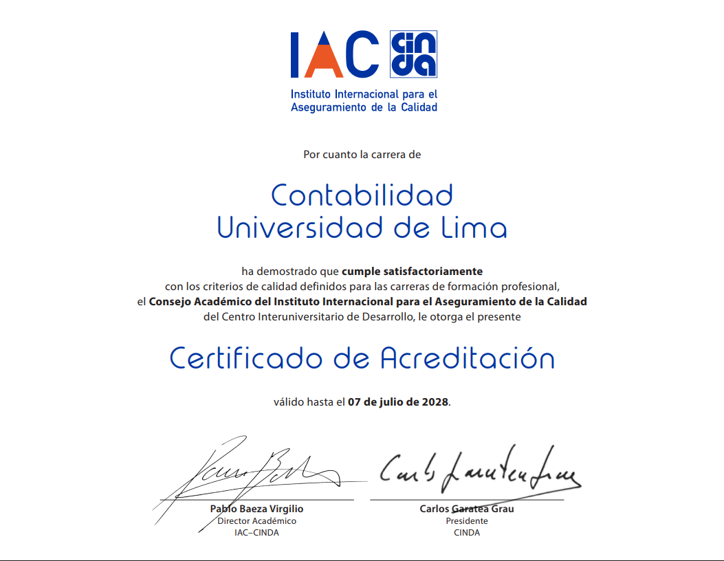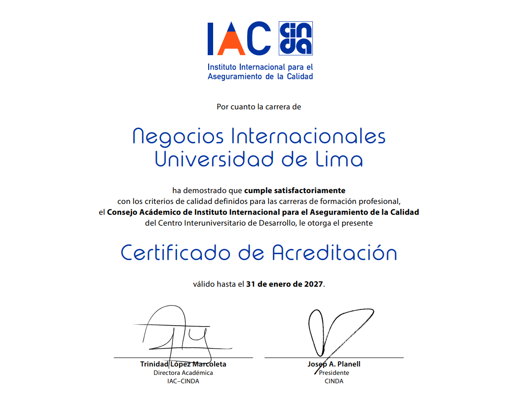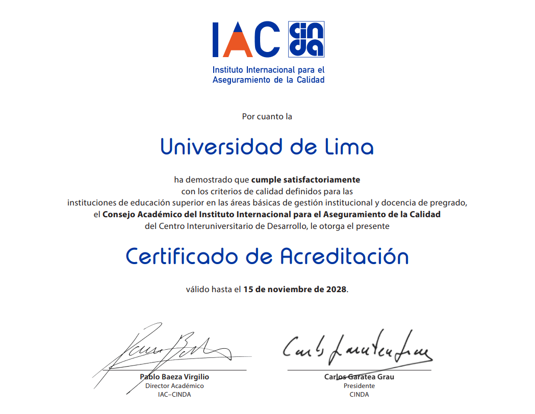 In alignment with its institutional vision and quality policy, Universidad de Lima is committed to the continuous improvement of its academic and administrative processes in accordance with international quality standards.