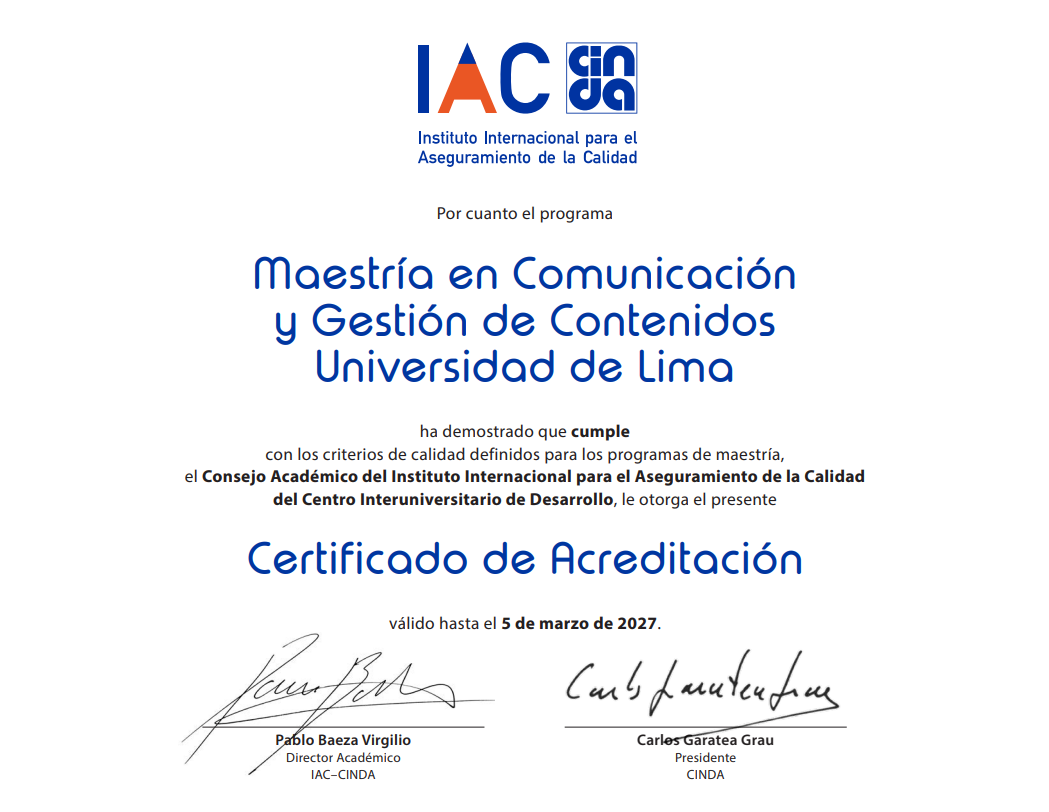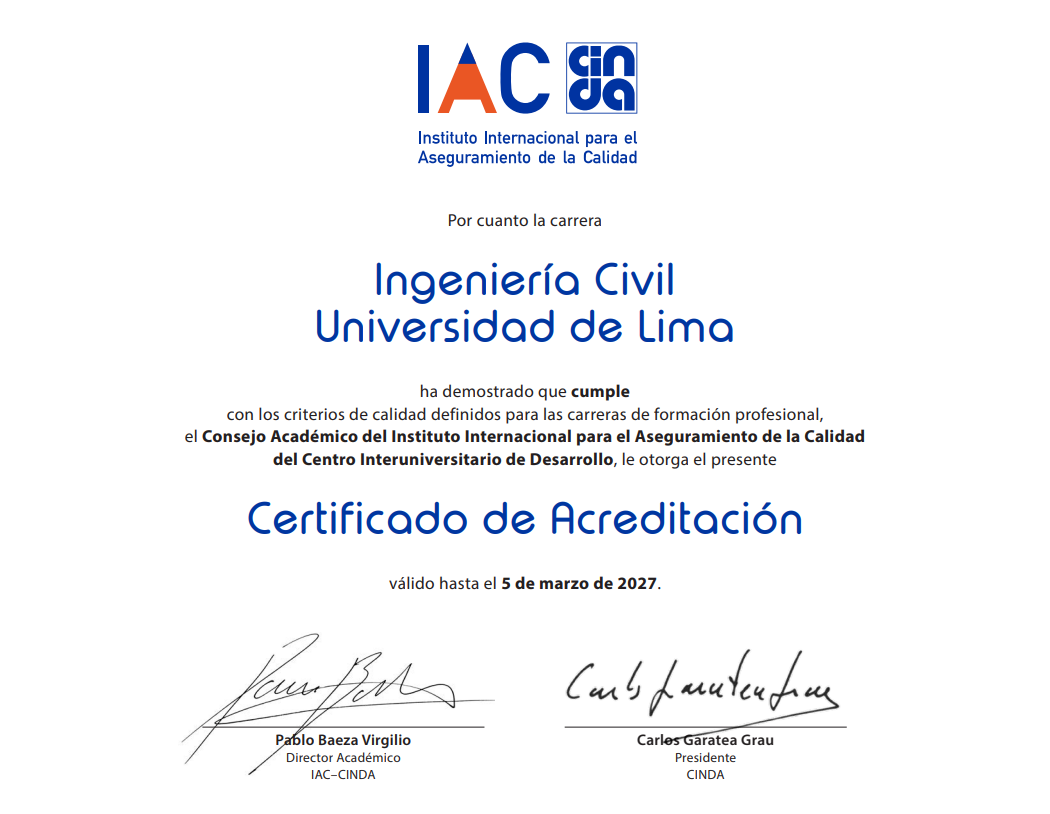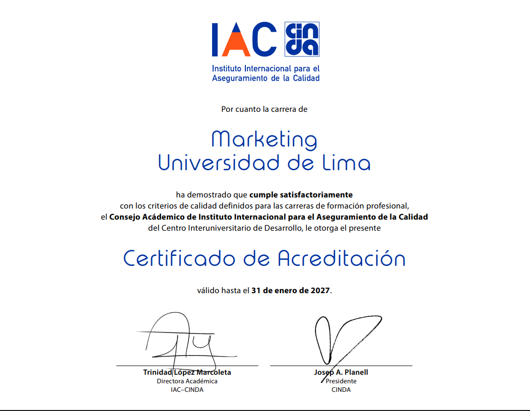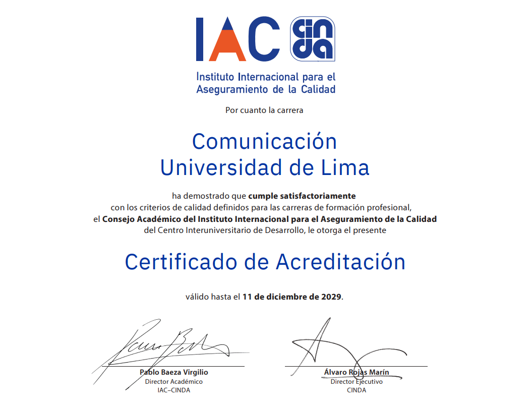In alignment with its institutional vision and quality policy, Universidad de Lima is committed to the continuous improvement of its academic and administrative processes in accordance with international quality standards.