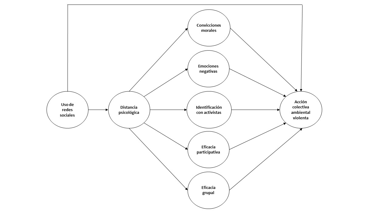 A partir del tema del uso de las redes sociales para fomentar comportamientos ecológicos y el aumento de las acciones violentas a favor del medioambiente, nuestro estudio Social media, psychological distance, and environmental collective action in Peru se propuso explicar cómo las redes sociales pueden promover la participación en iniciativas ambientales violentas. El modelo planteado incluye como variables mediadoras a diferentes tipos de distancia psicológica (distancia social, de probabilidad, temporal y espacial) y a las variables del modelo de la identidad social para la acción colectiva (convicciones morales, emociones negativas, identidad social con activistas, eficacia participativa y eficacia grupal) por su relación con el tema ecológico. A continuación, se presenta un gráfico del modelo.